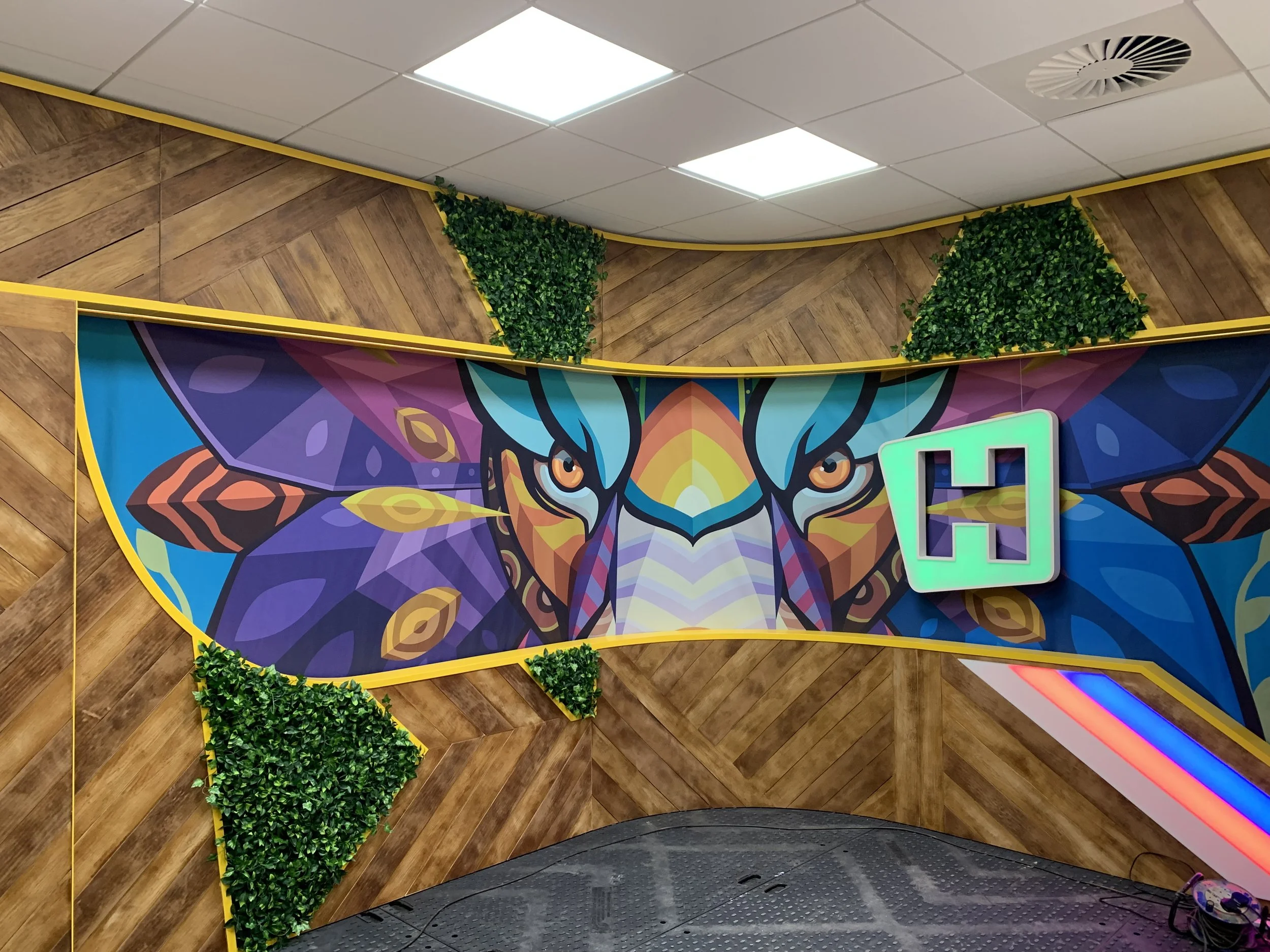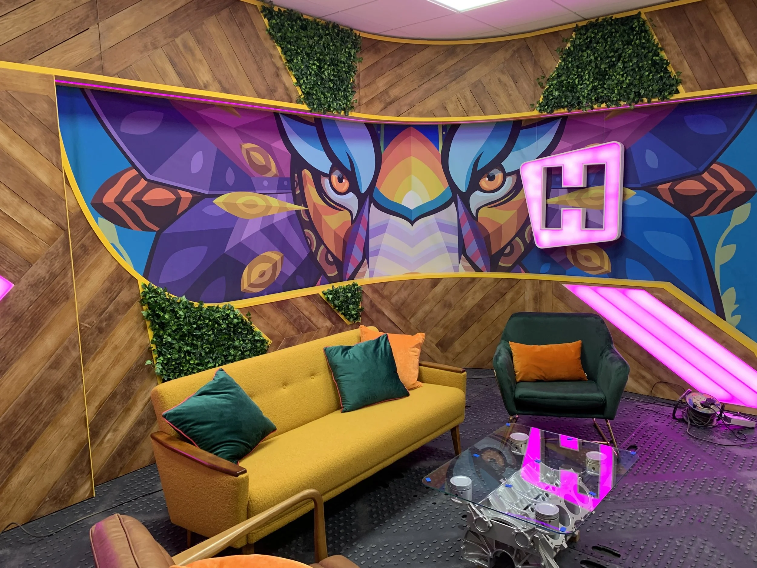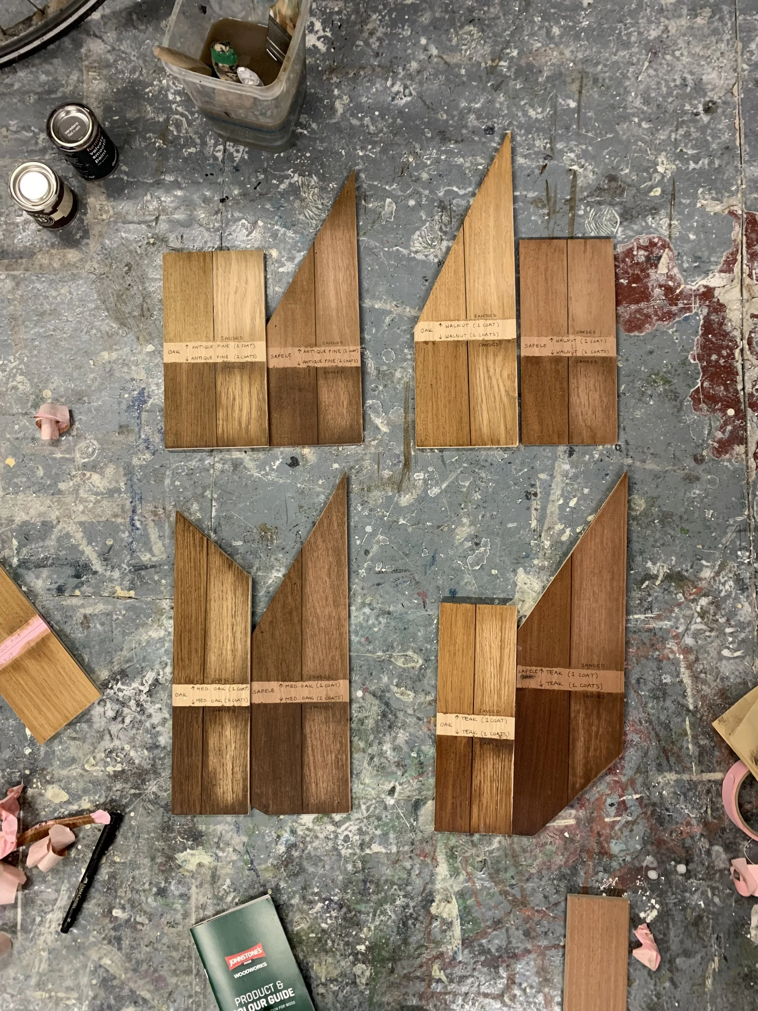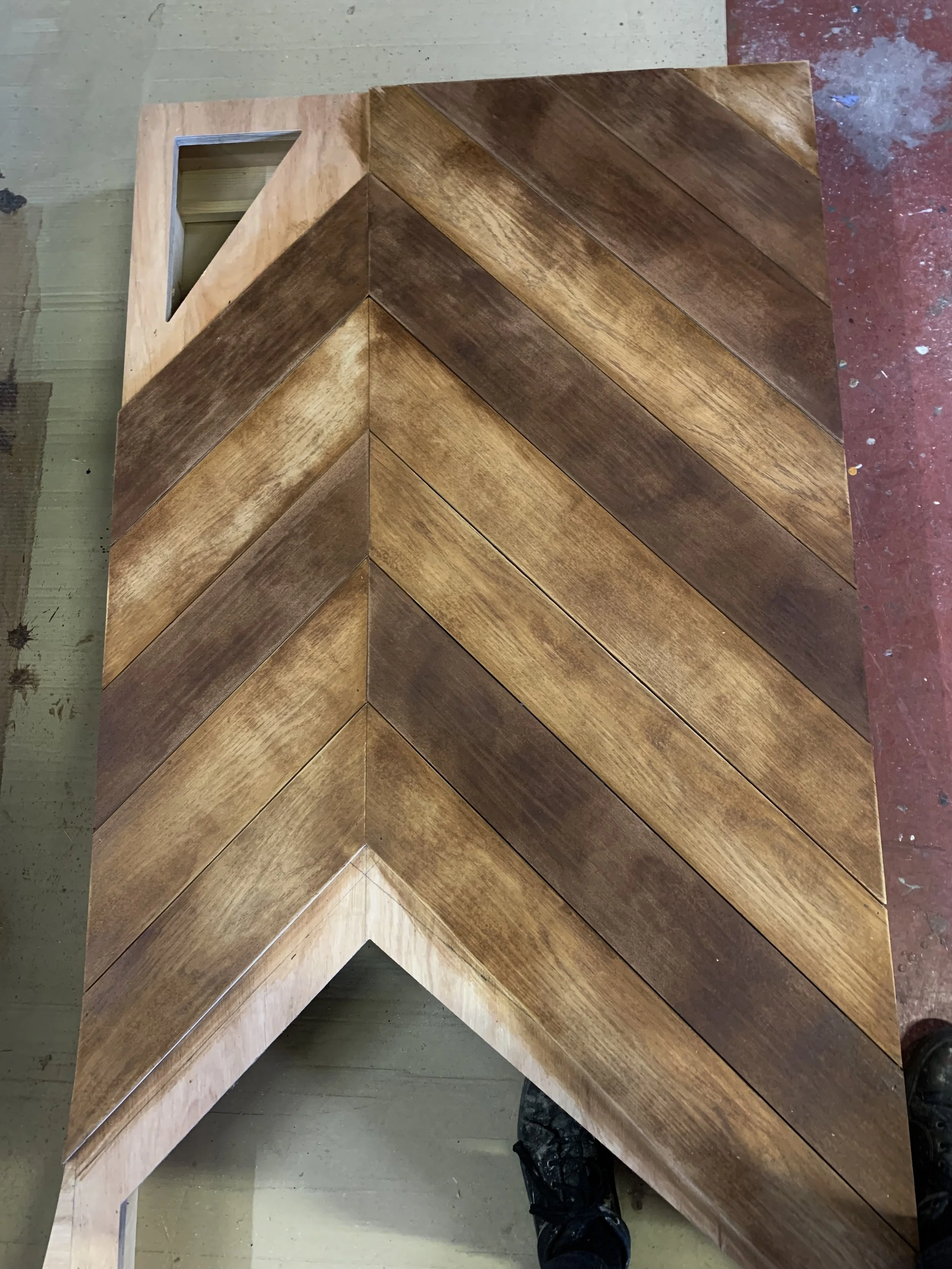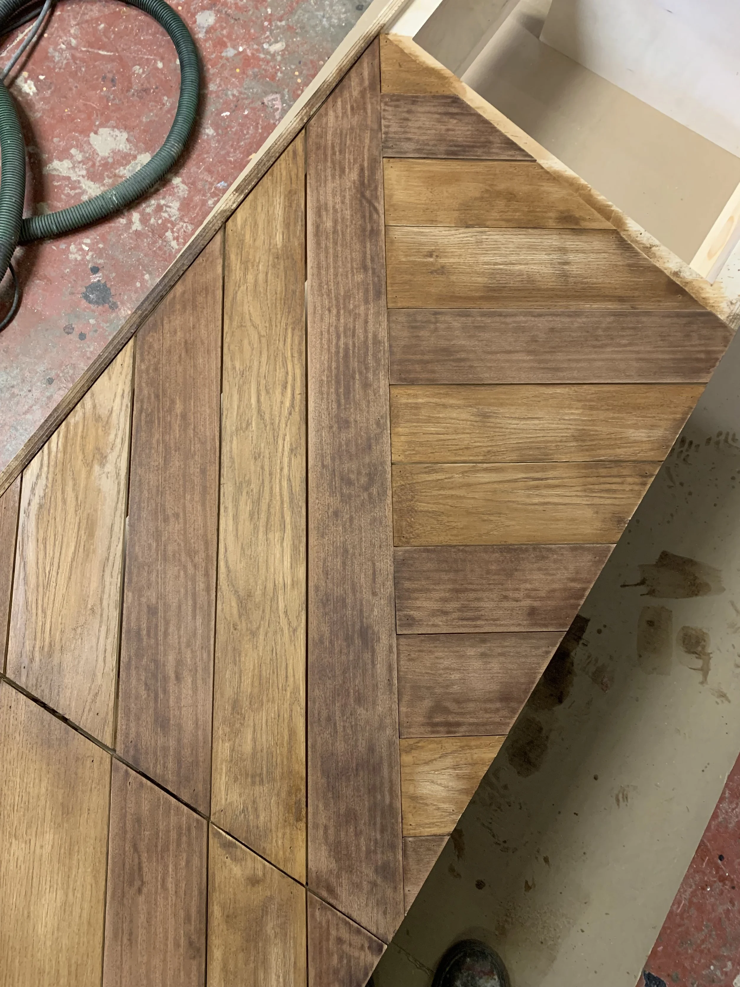 Scenic wood-staining and distressing the backdrop of the set built by Chateaux Projects