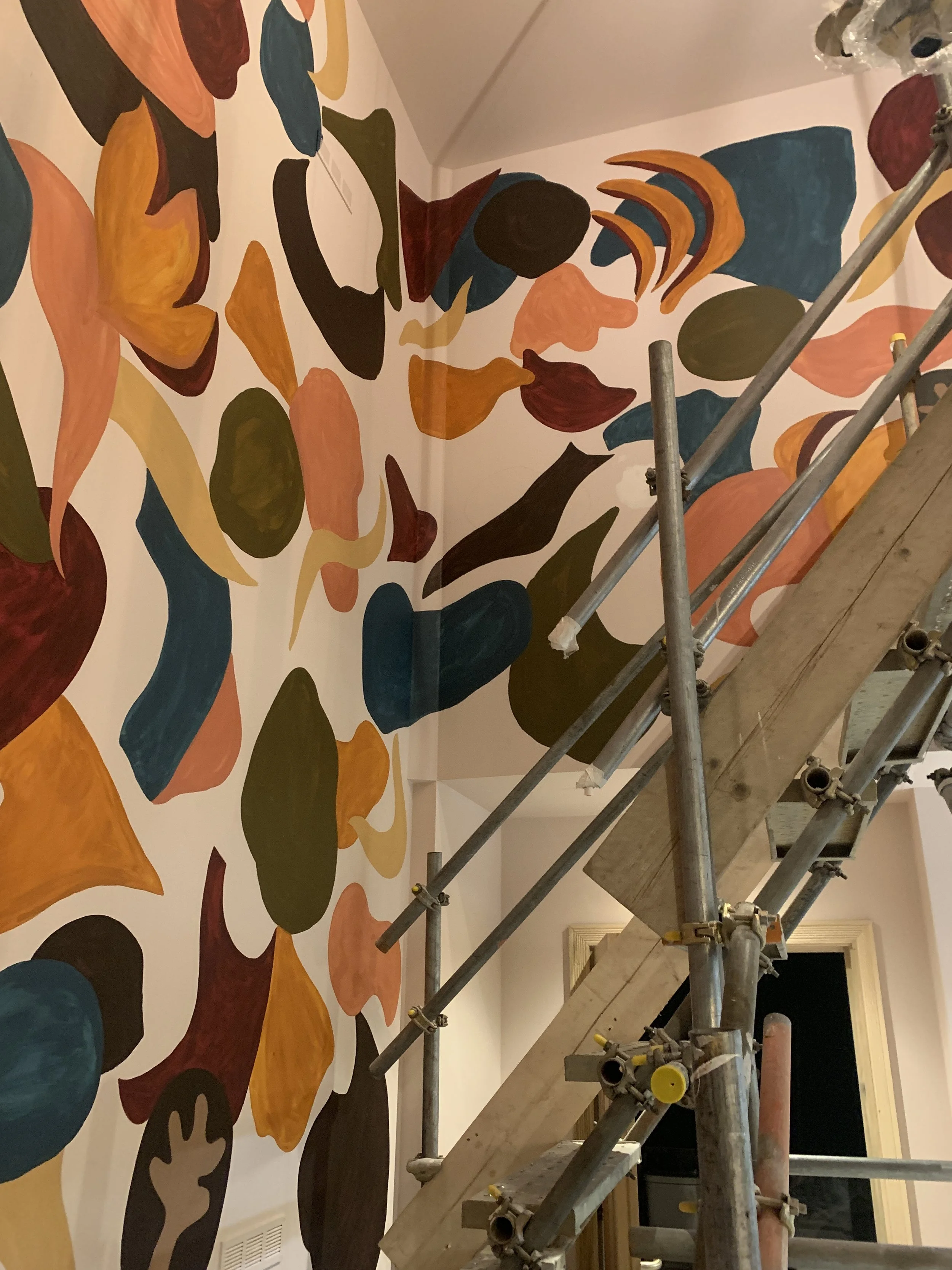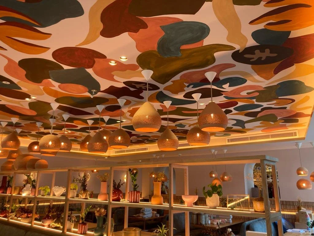 Hand painted ceiling and stairwell murals featured throughout the interior of the restaurant